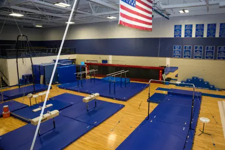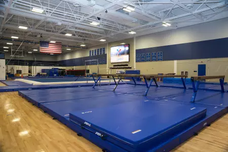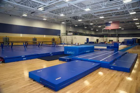 The other half of the gym will be the competition area and a divider is able to close off the training area during home meets. Bleachers flank the south and west ends of the facility, with an additional entrance into the gym built into the southwest corner. The venue also features a new scoreboard, lighting and infrastructure.