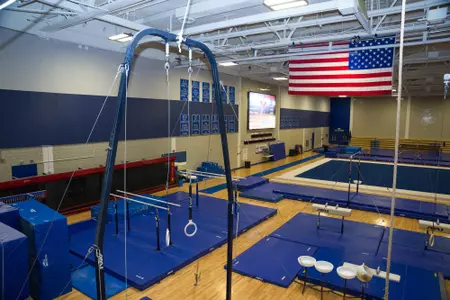The northern half of the facility will feature a state-of-the-art training space that includes a two-story structure that eliminated the need of the old secondary, auxiliary gym. The lower level features locker rooms and storage spaces, as well as the base of several training pits. The upper level will include vaulting runways, spring floor strips, a 16x16 resi-pit, a loose foam pit, a trench/canyon pit and a trampoline. The floor of the northern half also houses additional event apparatus for practice.