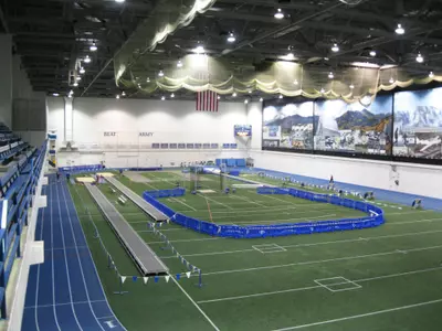 The track is a full-pour polyurethane surface of 268-meters (six laps/mile), with eight lanes on the straightaway and six lanes on the oval. Inside the oval is a FieldTurf surface that includes polyurethane runways for the pole vault, horizontal and high jumps, along with a throwing cage. The field house is equipped with a full-size Daktronics scoreboard and message center along with event-specific AAE field event scoreboards, and a FinishLynx computerized timing system.