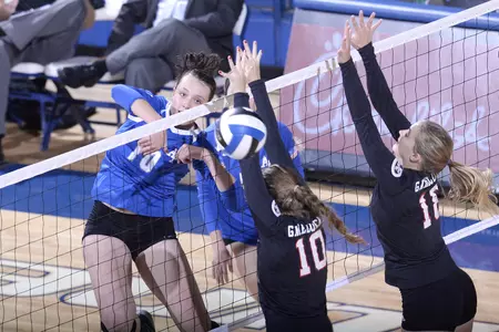 Freshman Denise Ssozi led all players with 16 kills, while sophomore Abigail Miksch (12), classmate Elizabeth Pennington (11) and junior Piper Heineck (10) also posted double-digit kill totals, as the quartet accounted for 49 of the team's 56 kills. Heineck, who hit at a team-best clip of .318 (10k-3e-22a), assisted on a match-high six blocks, while Pennington added three service aces. Sophomore Sarah Hellman tallied 38 assists, while classmate Shanleigh Conlan, who led the team in digs with 13, posted her first double-double after posting a season-high 12 assists.