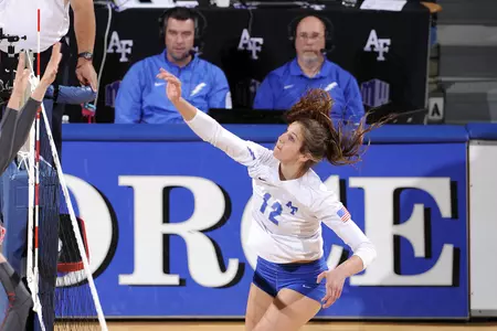 Sophomore Abigail Miksch led the Falcons with nine kills, while junior Piper Heineck and sophomore Elizabeth Pennington each tallied eight. Heineck also led the team in hitting (.400) and blocks (four), while Pennington tied for the match-lead with three aces. Sophomore Shanleigh Conlan and freshman Denise Ssozi rounded out the team leaders, as they paced Air Force in assists (27) and digs (10).