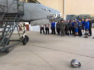 The Air Force football team was honored to spend some time with the great men and women of the 47th Fiighter Squadron at Davis Monthan Air Force Base while in Tucson, Ariz., for the Nova Home Loans Arizona Boal. Capt. Keith Madsen, a 2009 USAFA graduate and former tight end for the Falcons, talked to the team when they arrived on the flight line.