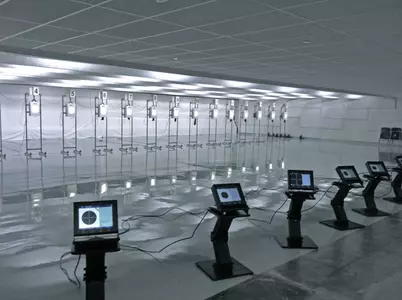 The range features a viewing area of the entire firing line with stadium style seating. Positioned directly above the viewing area are two TV screens, which display the athletes' targets and their scores. Spectators are able to follow the action during the competition. The team room is also available for spectators to relax and watch the competition on two 60" plasma TV's.