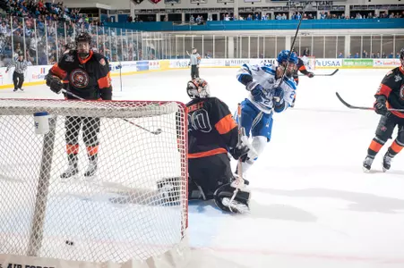 The Tigers (5-4-1 overall, 5-2-0 AHC) tied the game on the power play in the third period. Erik Brown was wide open on the back door and Myles Powell found him at 9:01. Just a few minutes later, Matt Pulver drew a penalty that led to a Falcon power play. Mehnert's shot from the point was re-directed in front by Baskin for a 4-3 lead at 11:23. RIT pulled its goalie with 56 seconds left and had the puck in the zone the entire time, but were unable to tie the game.