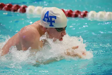 U.S. AIR FORCE ACADEMY, Colo. -- The Air Force men's swimming and diving team opened competition at the Art Adamson Invitational in College Station, Texas on Thursday, Nov. 16. The three-day meet consists of a prelim and final format. In events 200 yards or shorter, the top 32 athletes return to swim again in finals and in events 400 yards or greater, the fastest 24 athletes return. The invitational draws several notable swimming programs on the men's side to include Texas A&M, Utah, LSU and Hawaii. With 94 points, Air Force is in fifth place. Texas A&M leads the field with 425 points, followed by Utah (310), LSU (199) and Hawaii (109).