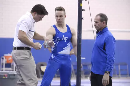 The Falcons are ranked eighth in the NCAA with a three-score average of 407.533. As a team, Air Force is ranked among the nation's top-five on the pommel horse (fifth, 68.367) and still rings (fifth, 69.533), while holding top-10 marks on the parallel bars (ninth, 68.167) and high bar (10th, 67.267). Individually, Tim Wang is ranked fourth on the pommel horse (14.783), fifth on both the vault (14.817) and all-around (84.050) and eighth on the still rings (14.650), while Jonathon Fornoff is tied for eighth on the parallel bars with a three-score average of 14.333.