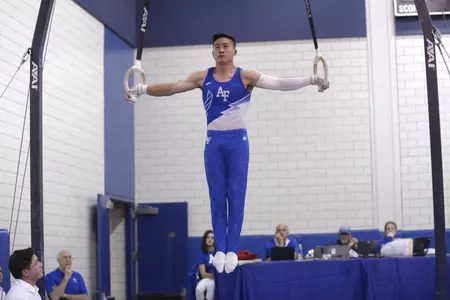 Wang, who totaled an 83.100 as the lone all-arounder, paced Air Force to four of the top-five scores on the pommel horse (14.350) and still rings (14.500), as well as three of the top-five marks on the floor exercise (14.050). The senior, competing in his final meet at Cadet West Gym, also earned runner-up honors on the parallel bars (career-best 14.250) and a fifth-place score on the high bar (13.000).
