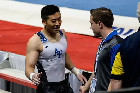 Wang captured three event titles and earned a first-place finish in the all-around on Saturday, March 4, as Air Force captured its first victory ever over California – and earned first-place team honors at the Cal Benefit Cup. The native of Riverside, Calif., won the pommel horse (14.700), still rings (14.150), vault (14.650) and all-around (84.200), while posting a career-best 14.350 to finish second on the floor exercise. With his floor score, Wang moved into second on the Academy's all-time list in that event.