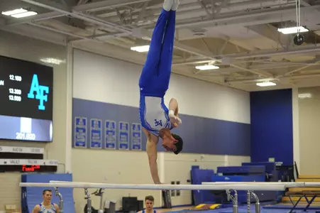 Less than a week after competing in California, the ninth-ranked Air Force men's gymnastics team travels across the country for a pair of weekend competitions. The Falcons will face No. 11 Navy and No. 14 William and Mary in Annapolis, Md., on Friday, March 10, before heading to Chicago, Ill., on Sunday, March 12, for a meet with No. 18 Illinois-Chicago. Friday's meet is slated to begin at 6:00 p.m. (ET), while Sunday's meet will get underway at 1:00 p.m. (CT).