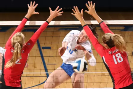 Backed by an impressive .846 hitting percentage from senior Piper Heineck, the Falcons combined to hit over 400 in the match (.432). Heineck, who also paced the Falcons with five blocks (one solo, four assisted), registered 12 kills on 13 swings, with just one error. Freshman Kathleen Medill hit .600 on the day, with six kills and no errors on 10 attempts, while sophomore Denise Ssozi registered a .483 average, after recording a match-high 16 kills on 29 attempts and just two errors. Junior Shanleigh Conlan, who tallied 27 assists on the day, was one of five Falcons to record a service ace in the match (Jordan Daniels, Heineck, junior Lauren Heldt, Sarah Hellman). Daniels and Ssozi rounded out the Falcons' statistical leaders with six digs apiece.