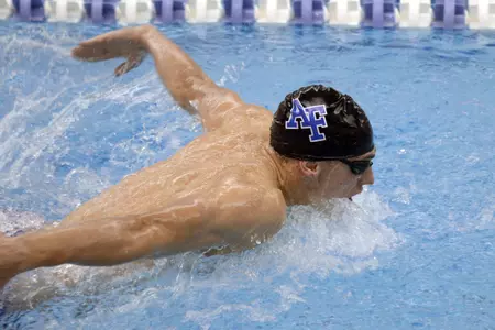 Opening the meet with a new pool record, Air Force's 200 medley relay, consisting of sophomore Cole McAnany, senior Derek Brecht, senior Joey Gebhart, and senior Lars Knutson, took first place with a time of 1:31.91. In the first of many outstanding swims for McAnany, his lead off on the relay was his fastest 50 backstroke to-date. Fourth place went to the Falcon 'B' Relay (1:35.77) made up of freshman Ben Settle, sophomore Zach Nelson, freshman Jack Ayres, and freshman Erik Orr.