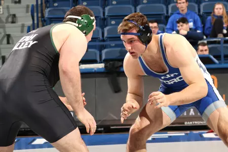 Sophomore heavyweight Matt Wagner met with Sam Eagan in the seventh bout of the evening. The wrestlers entered the third period tied at one with an escape apiece. Wagner took a single-leg shot and converted the takedown points, lifting the Falcon to a 3-1 decision at the final whistle.