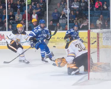 "I am the luckiest guy in the building tonight because we deserved to get our butts beat," head coach Frank Serratore said. "We were very fortunate to get three points in this series. We were better in the first period, but then AIC started to take over. We took a step back tonight. Our penalty kill was good and Billy kept us in it again. Give AIC credit, they are a good team. But I am very, very, very disappointed with our composure late in the game and in overtime."