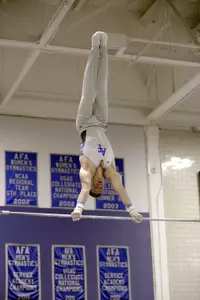 Lukas Texeira collected an event title this afternoon, as he registered a 13.950 to finish first out of 15 gymnasts on the high bar. The junior paced Air Force to a pair of finishes within the top half of the field on that event, as classmate Eric Klein tied for sixth with a score of 13.300. Klein also helped the Falcons to three placements within the top seven on the vault, as he and fellow junior Jonah Urlaub tied for the team lead (fourth) with matching scores of 14.000 and freshman Frankie Valentin added a seventh-place finish on the vault with a score of 13.850. Air Force also accounted for multiple finishes within the top half of the 15-gymnast field on the parallel bars, as freshmen Ethan Esval and Allen Shadan tied for fourth (13.600) and sixth (13.500), respectively.